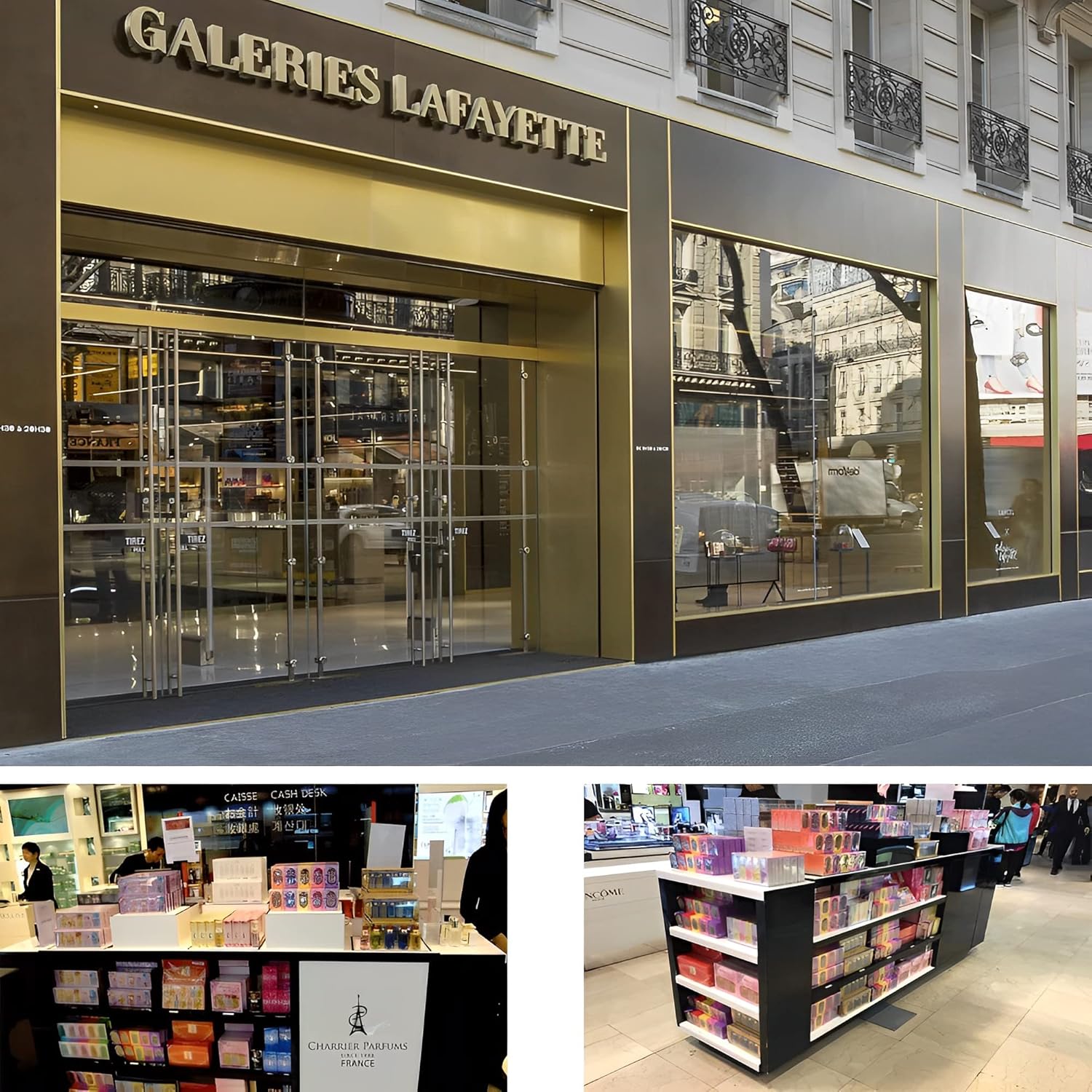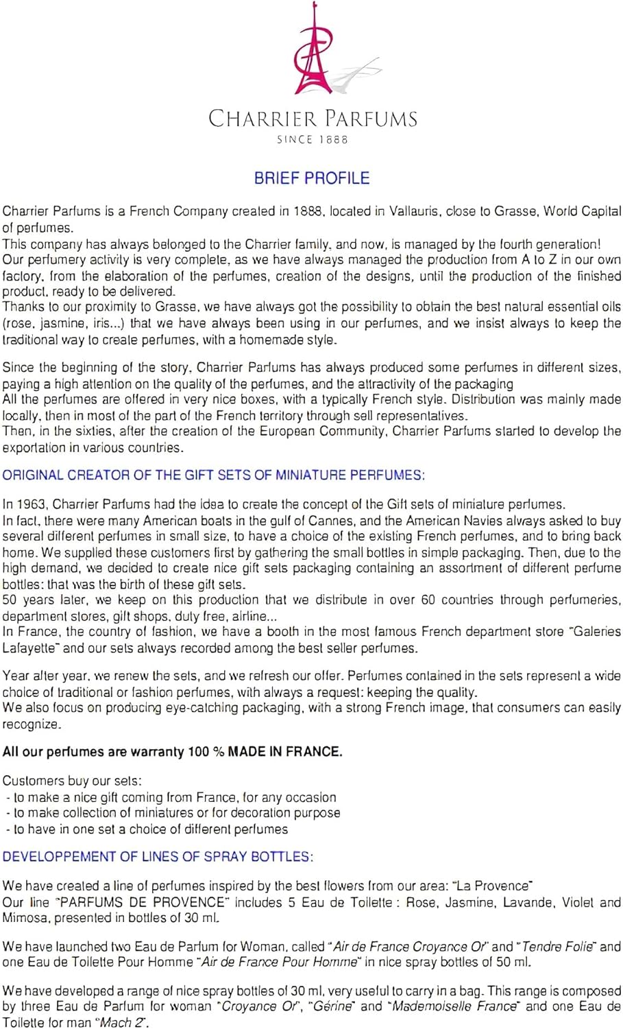 Fragrances de Luxe från företag CHARRIER Parfums - familjeparfym sedan 1888 nära Grasse, världens parfymhuvudstad för parfymer. "Desert water" med en blommig, fruktig och akvatisk karaktär och toner av citron, embryo och cederträ ( 12 ml). "Wizzy" med blommiga, träiga och muskulösa egenskaper och toner av gardenia, jasmin och santal (12 ml). "Miss Charrier" inklusive orientalisk och vaniljfärgad karaktär och dess toner av persika , björnbär och bärnsten (12 ml). "Woman's folie" med en blommig karaktär, trä och muskotnöt. Noterna av muguet, iris och cederträ (12 ml), "Vagabond" med en träig-blommig karaktär och mandarin, äpple och karamell (12 ml).