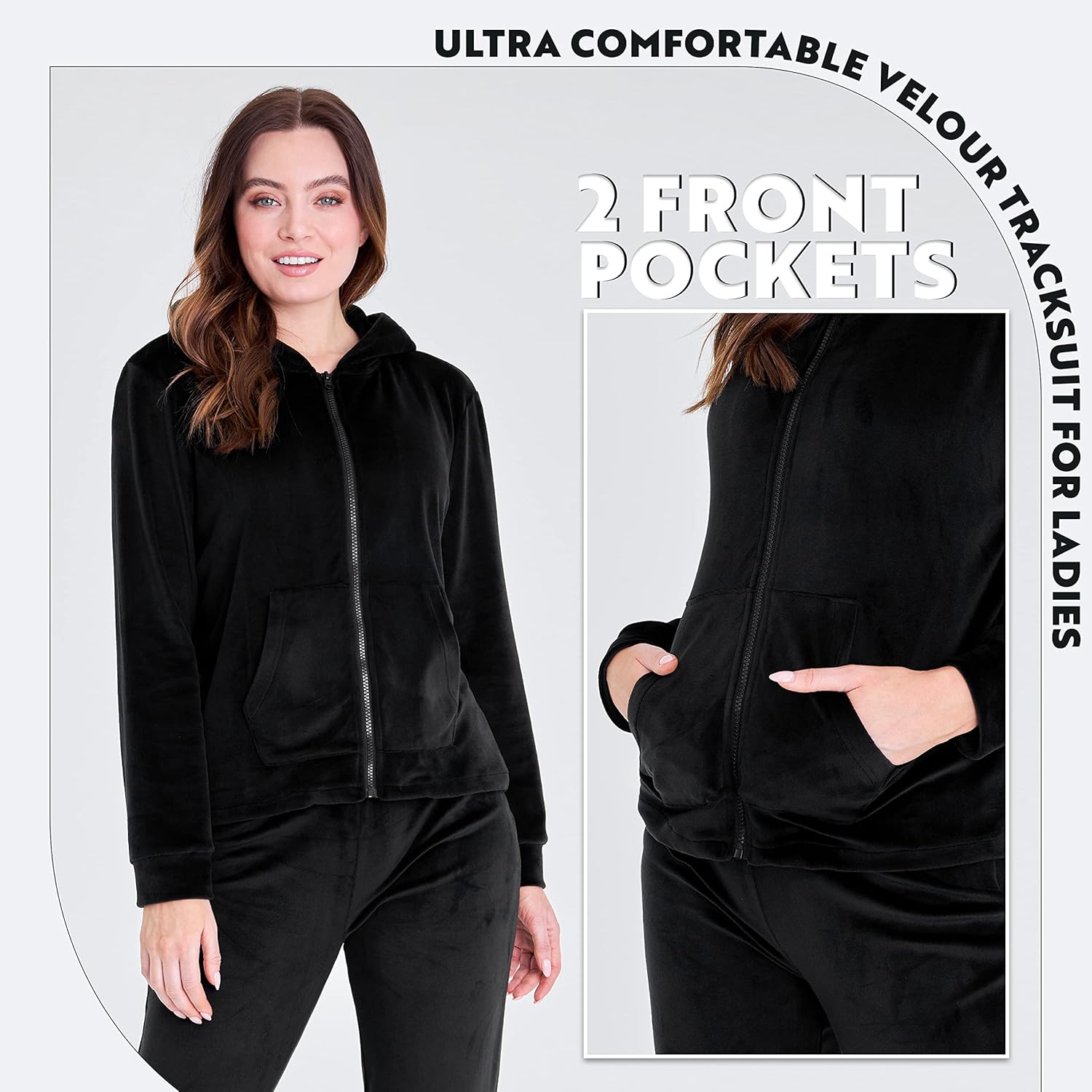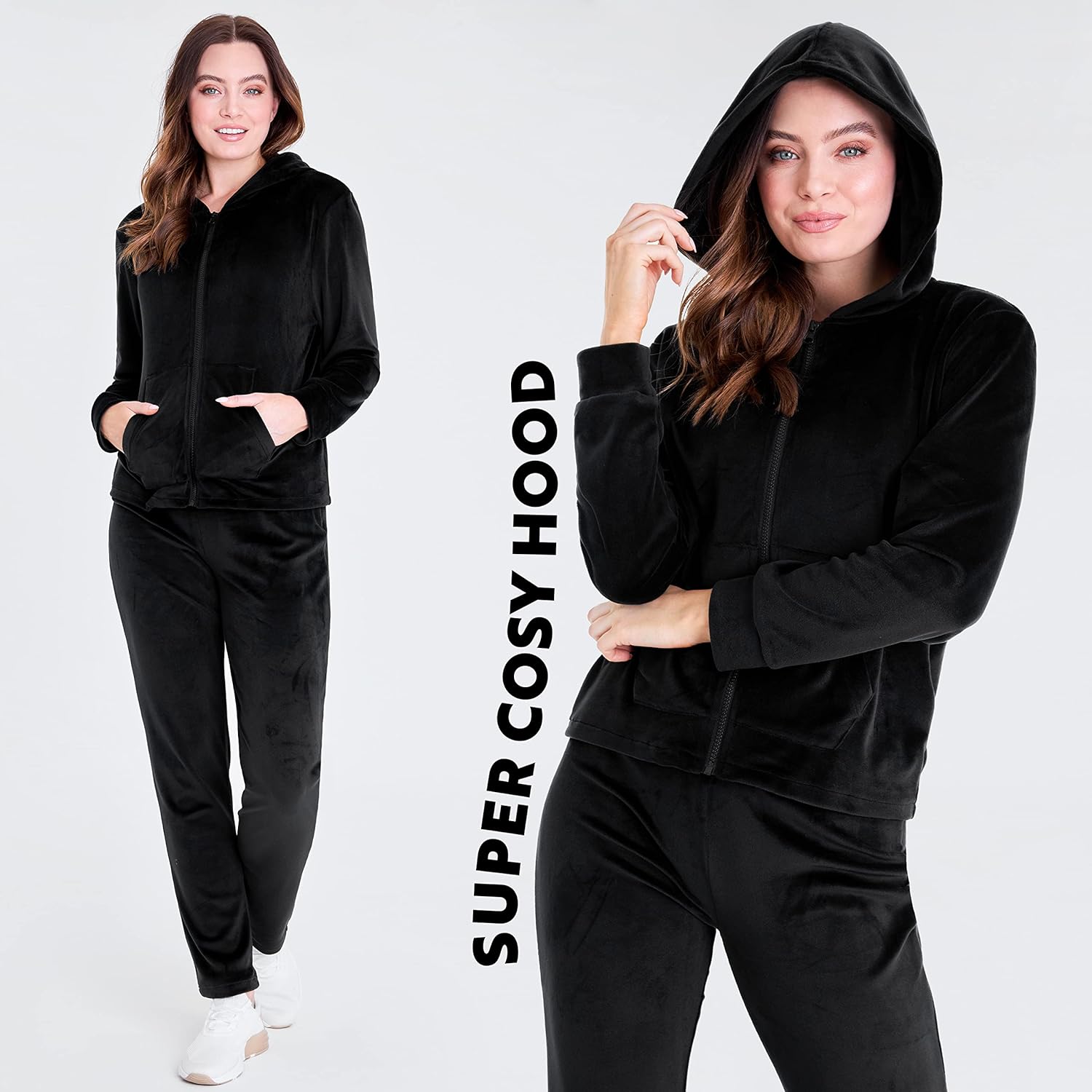- Tillverkad av supermjukt velourmaterial, med en huva, hel dragkedja framtill, 2 framfickor, manschettärmar och byxor med dragsko elastisk midja