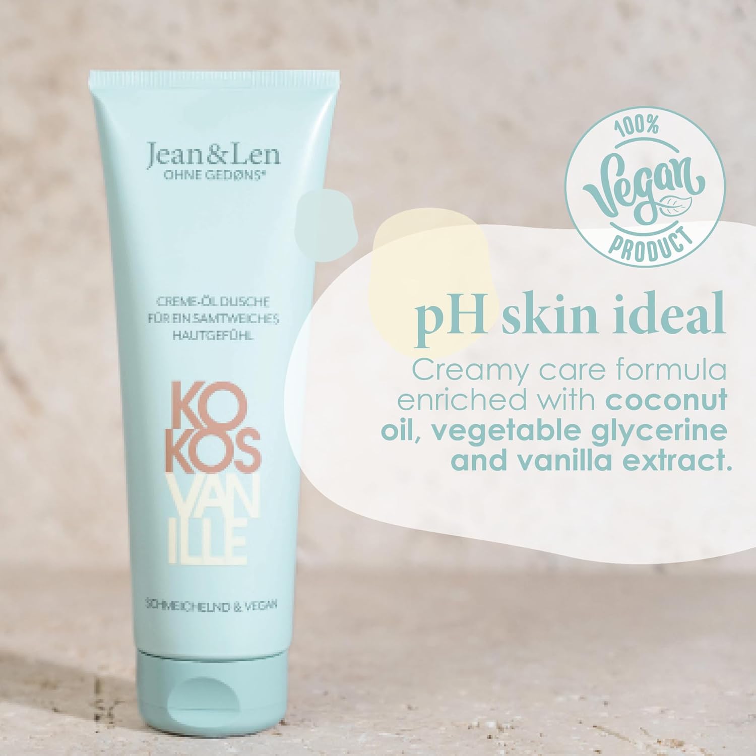 - Leveransomfattning: 1 x 250 ml Jean&Len dusch-cremeolja kokos och vanilj, för torr hud, krämig formula, för en skonsam rengöring och märkbart mjuk hudkänsla, pH-hudneutral duschgel
